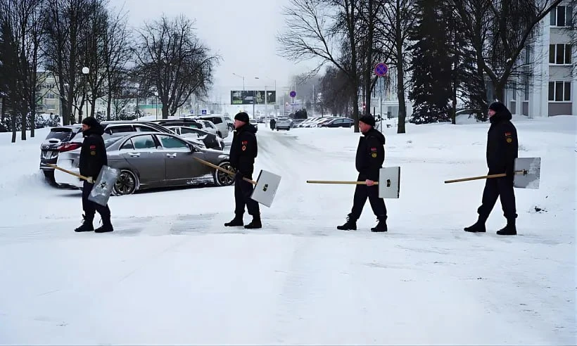 Якая краіна, гэткія і «бітлы». Працаўнікі Дзяржкамітэту судовых экспэртызаў таксама выйшлі прыбіраць сьнег. Менск, студзень 2026 г. Фота Instagram: sudexpert_by