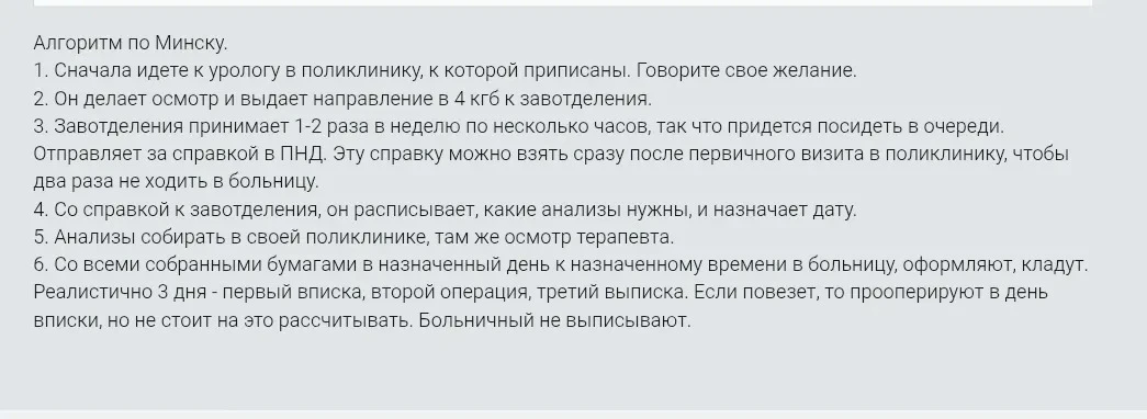 «В БСМП Гродно, в отделении урологии муж делал вазэктомию. Утром лег, через пару часов операция, на следующий день выписали. Швы небольшие, первые пару дней были тянущие ощущения. Через два месяца по спермограмме все чисто.