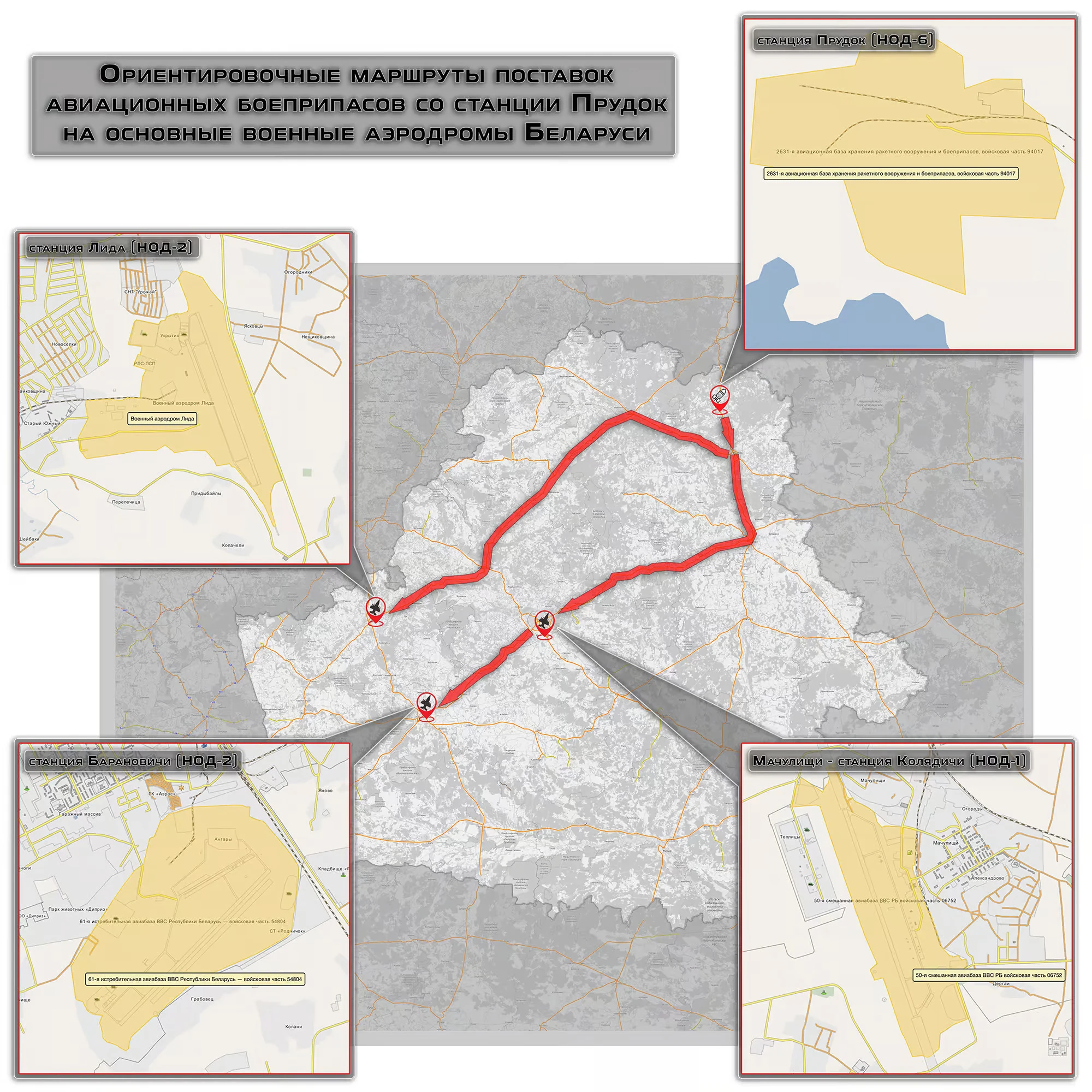 Как отмечает Сообщество железнодорожников Беларуси, 2631-я авиационная база хранения ракетного вооружения и боеприпасов, расположенная у станции Прудок, в 2024 году получила наибольший объём российских боеприпасов среди всех объектов на территории Беларуси.