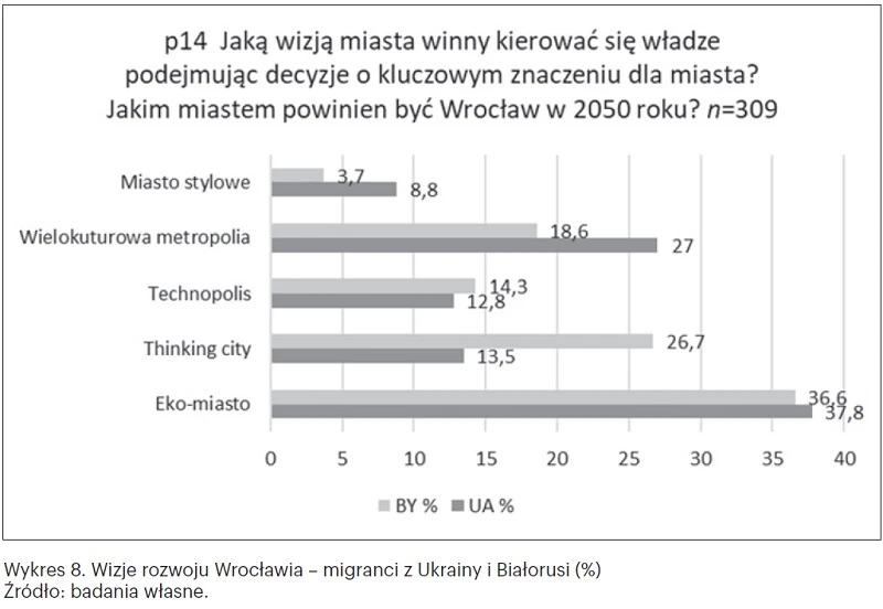 Украинцы чаще высказывают необходимость движения к «мультикультурному мегаполису», тогда как беларусы выступают за развитие Вроцлава как «мыслящего города».